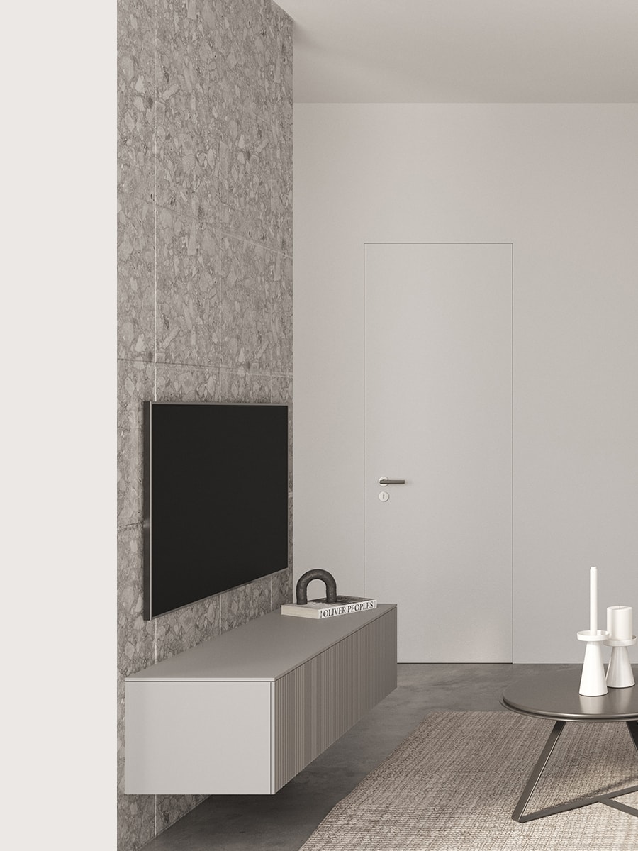 Realizzato in materiale melaminico di colore grigio, il mobile tv è l’unica mobilia della stanza.
