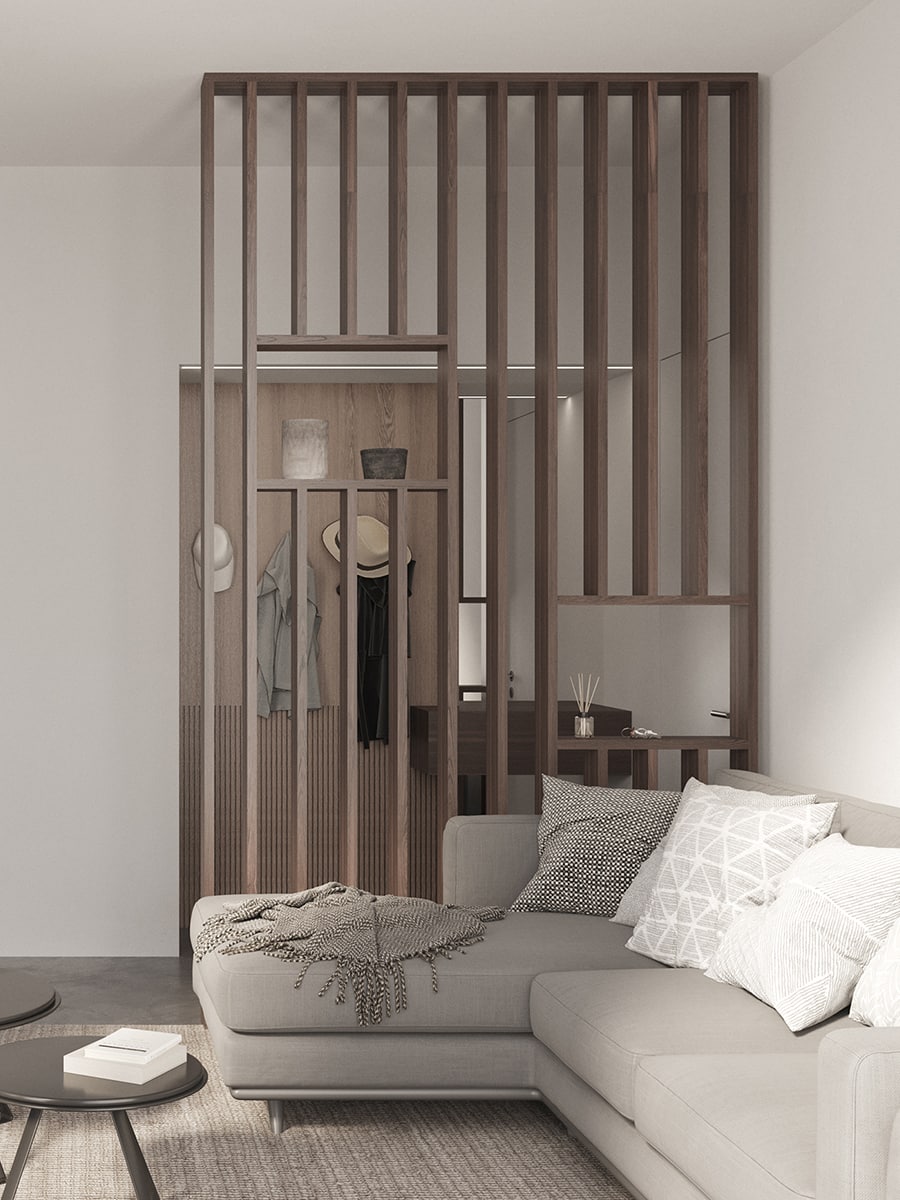 Il divisorio, che è l’unico arredo in legno, aggiunge colore al soggiorno spezzando così la monocromia della stanza.